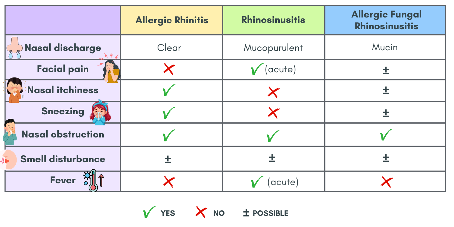 – Discolored discharge (unilateral predominance) & purulent secretion in the nasal cavity
