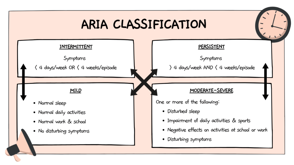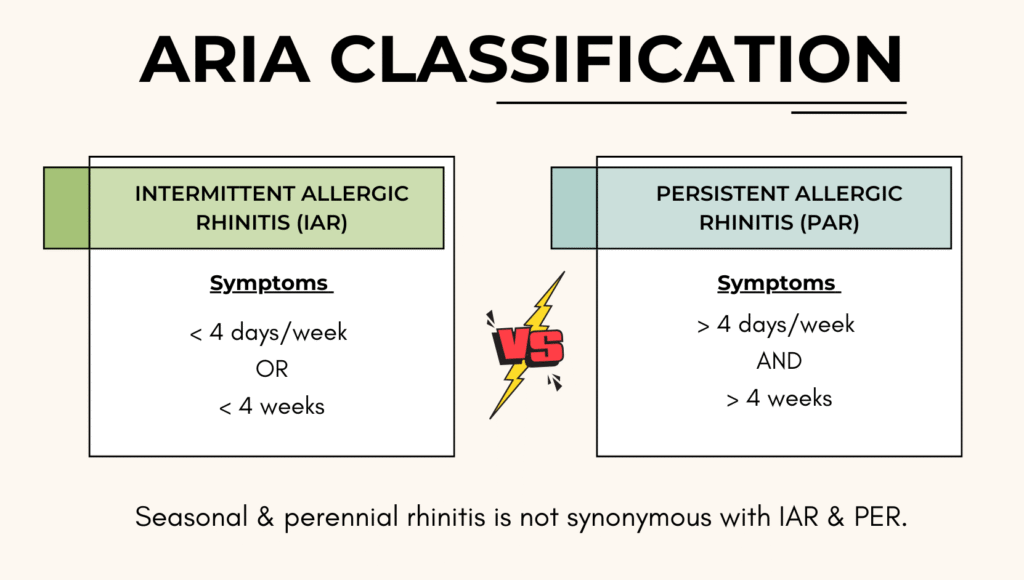 In view of these, ARIA has came out with another classification which divide allergic rhinitis into intermittent & persistent based on duration of symptoms occurrence.