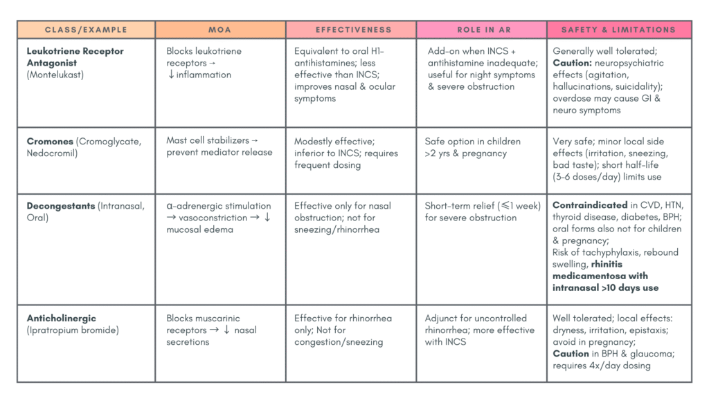 - Adjuvant/add-on therapy: Leukotriene receptor antagonist (Montelukast), Intranasal/oral decongestants, Intranasal ipratropium