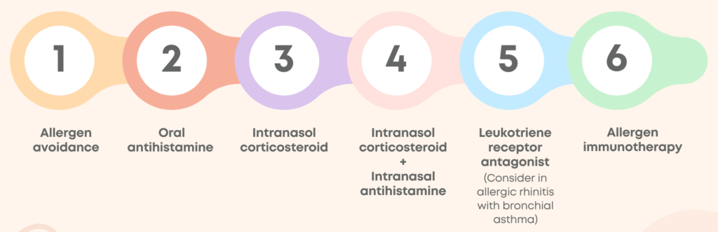 - Pharmacotherapy – including antihistamines, intranasal corticosteroids, & other appropriate medications tailored to symptom severity.