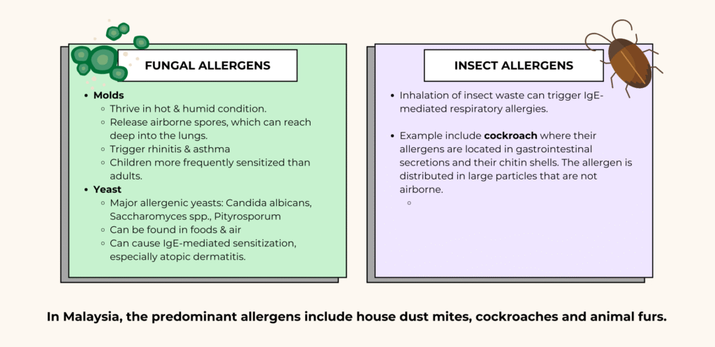 - Perennial: Caused by indoor allergens such as house dust mites, animal danders, cockroaches & molds.
