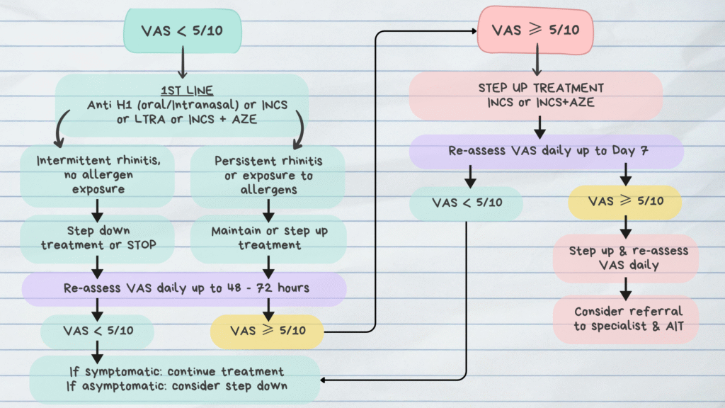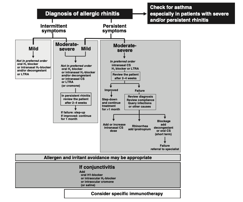 - Allergen-specific immune therapy – considered in patients with persistent symptoms despite pharmacological treatment or where long-term disease modification is desired.