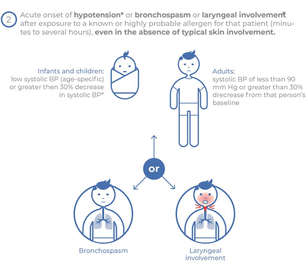 Acute onset of hypotension, or bronchospasm or laryngeal involvement after exposure to a known or highly probable allergen for that patient (minutes to several hours), even in the absence of typical skin involvement.