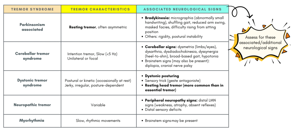 The table below shows some of the combined tremor syndrome and their associated neurological signs that we should keep a lookout for.