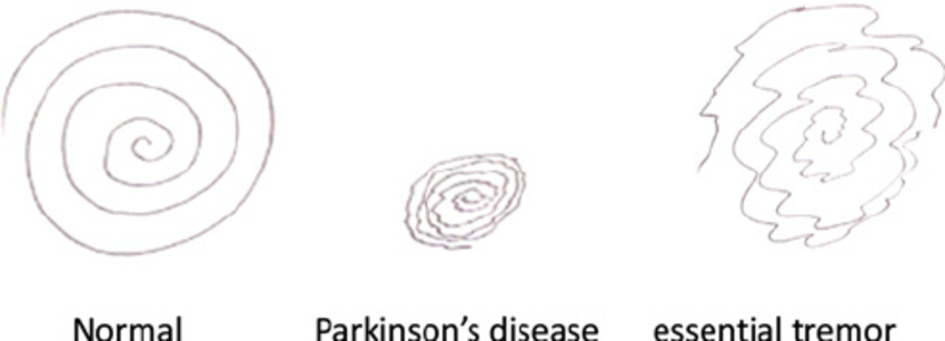 Large shaky spiral is suggestive of essential tremor whereas small, quivery spiral points towards Parkinsonism