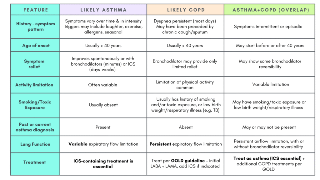 The table below provides some clues in differentiating Asthma, COPD and also Asthma-COPD overlap.
