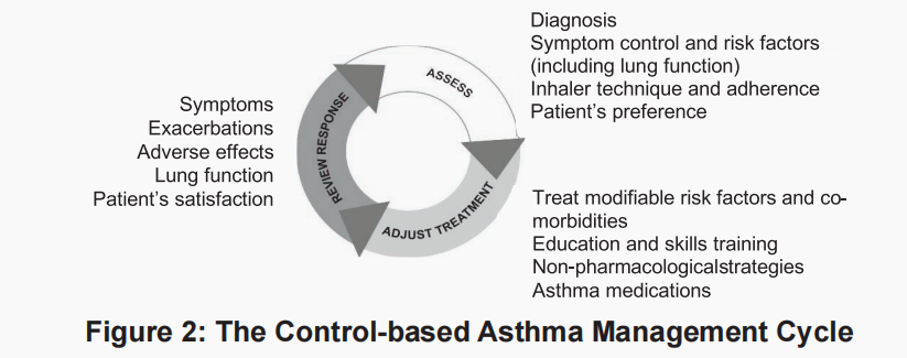 This asthma management cycle (GINA guideline) generally sums up all the important points while managing an asthma patient, which include: