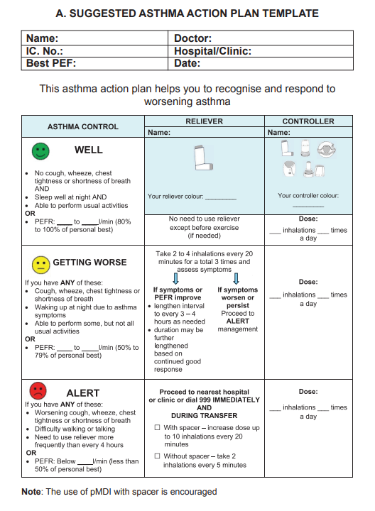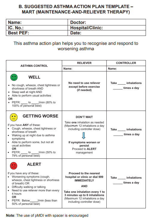 Our Malaysia CPG guideline has done an excellent job in providing a well-prepared suggested asthma action plan template tailored to patients on either MART therapy or separate reliever and controller regimens.