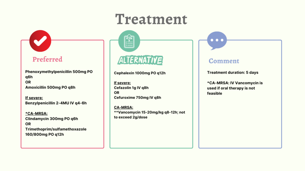 - Oral penicillin – Phenoxymethylpenicillin (Penicillin V) 250mg PO q12h (500mg PO q12h if BMI ≥ 33) OR