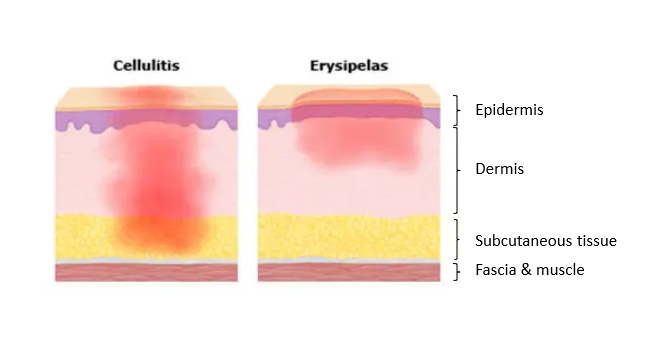 They are both bacterial skin infection, where erysipelas mainly involves the superficial dermis and possibly the superficial lymphatics, and cellulitis involves the deeper dermis and may extend up to the subcutaneous tissue.