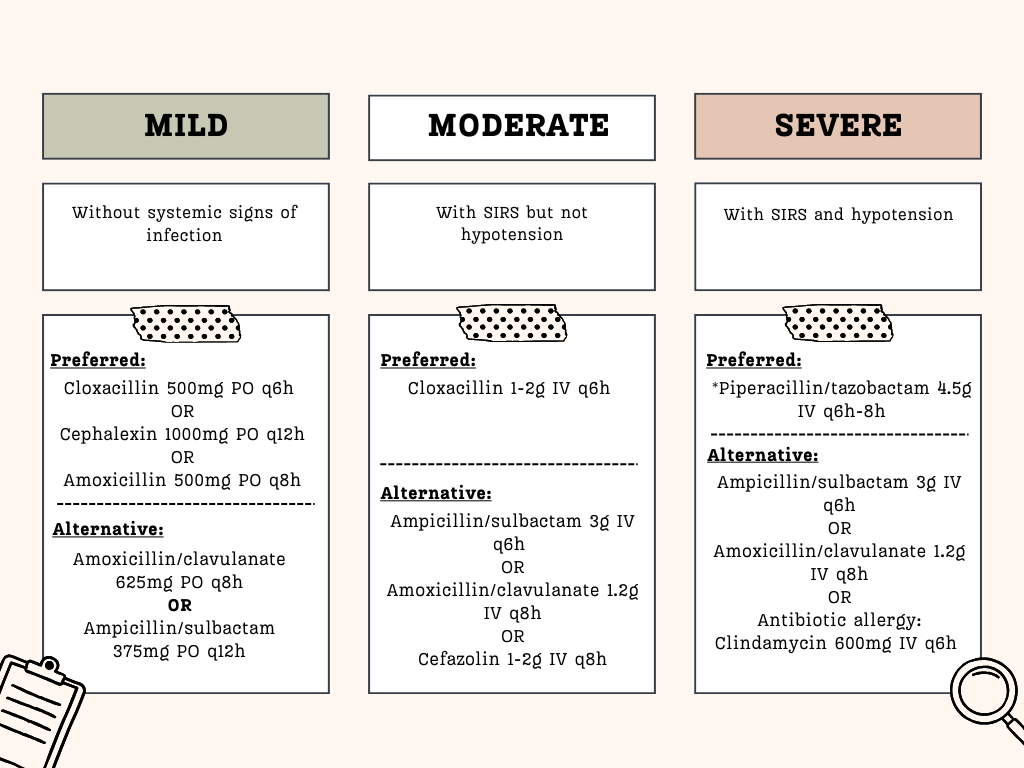 - Stevens, D. L., Bisno, A. L., Chambers, H. F., Dellinger, E. P., Goldstein, E. J., Gorbach, S. L., Hirschmann, J. V., Kaplan, S. L., Montoya, J. G., Wade, J. C., & Infectious Diseases Society of America (2014). Practice guidelines for the diagnosis and management of skin and soft tissue infections: 2014 update by the Infectious Diseases Society of America. Clinical infectious diseases : an official publication of the Infectious Diseases Society of America, 59(2), e10–e52. https://doi.org/10.1093/cid/ciu444