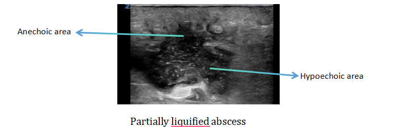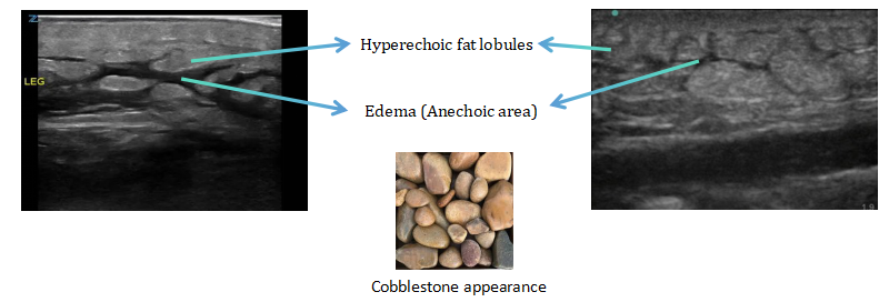 Later: “Cobblestone” appearance – Hyperechoic fat lobules separated by anechoic fluid-filled areas (Note that “cobblestone appearance may also be seen in fluid overload conditions, e.g. heart failure, renal failure, etc.)