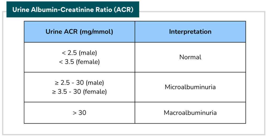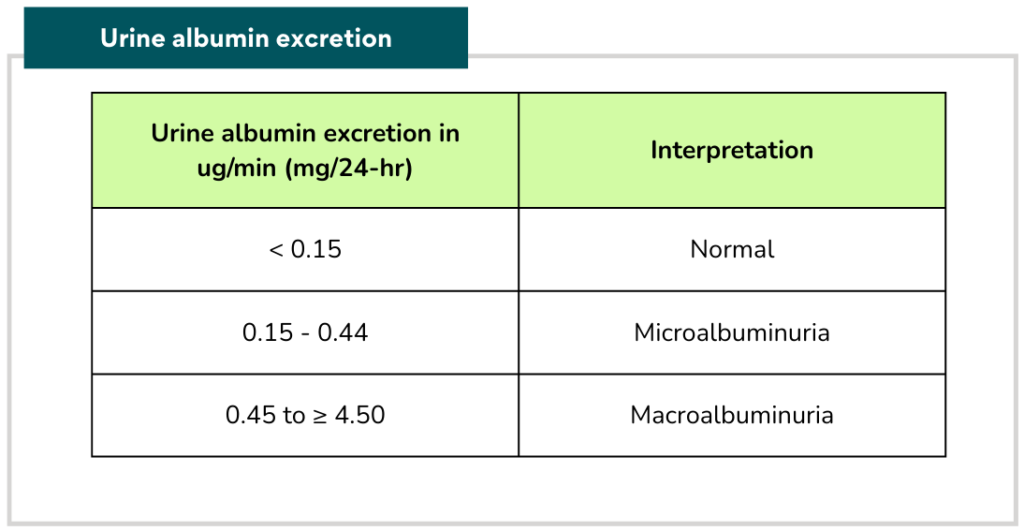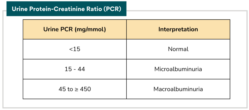 Proteinuria can be detected by: Urine dipstick, Urine Albumin-Creatinine Ratio (ACR), Urine Protein-Creatinine Ratio (PCR), Urine total protein excretion and Urine albumin excretion.