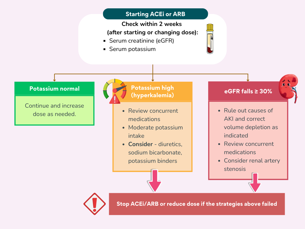 Once ACEi or ARB is initiated, the renal function should be repeated within 2 weeks, to look for any hyperkalemia, significant raised in creatinine and/or decrease if eGFR