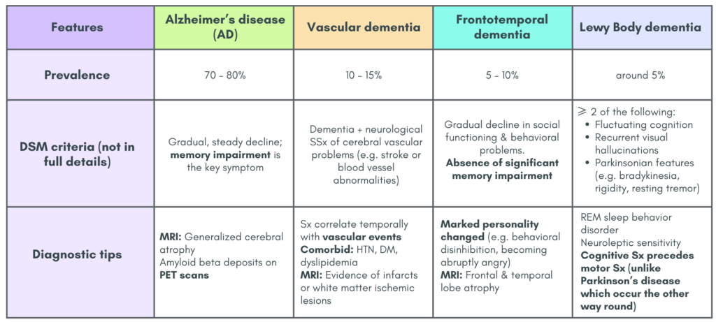 Features of some of the dementia types