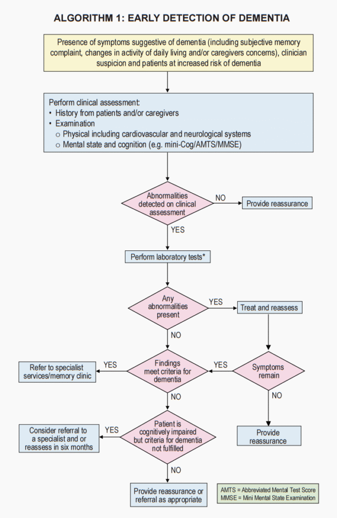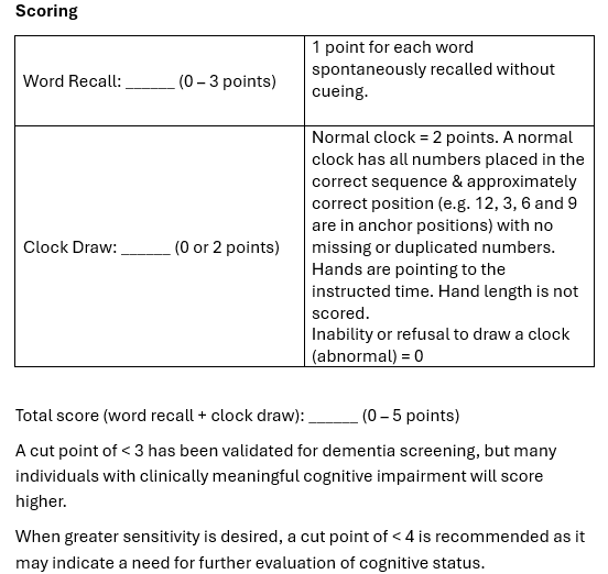 • Assessment tools that may be more practical in primary care: Mini-Cog, Abbreviated Mental Test Score (AMTS), Mini-mental status examination (MMSE)