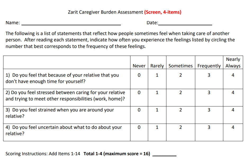 The 4-items ZBI assessment can be used as a screening, which may be more useful in primary care.