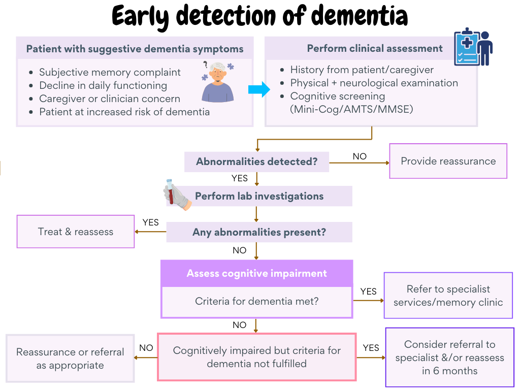 All patients suspected of dementia should be referred to a specialist (e.g. geriatrics/psychiatry/neurology) for confirmation of diagnosis due to the need for comprehensive assessments & investigations.