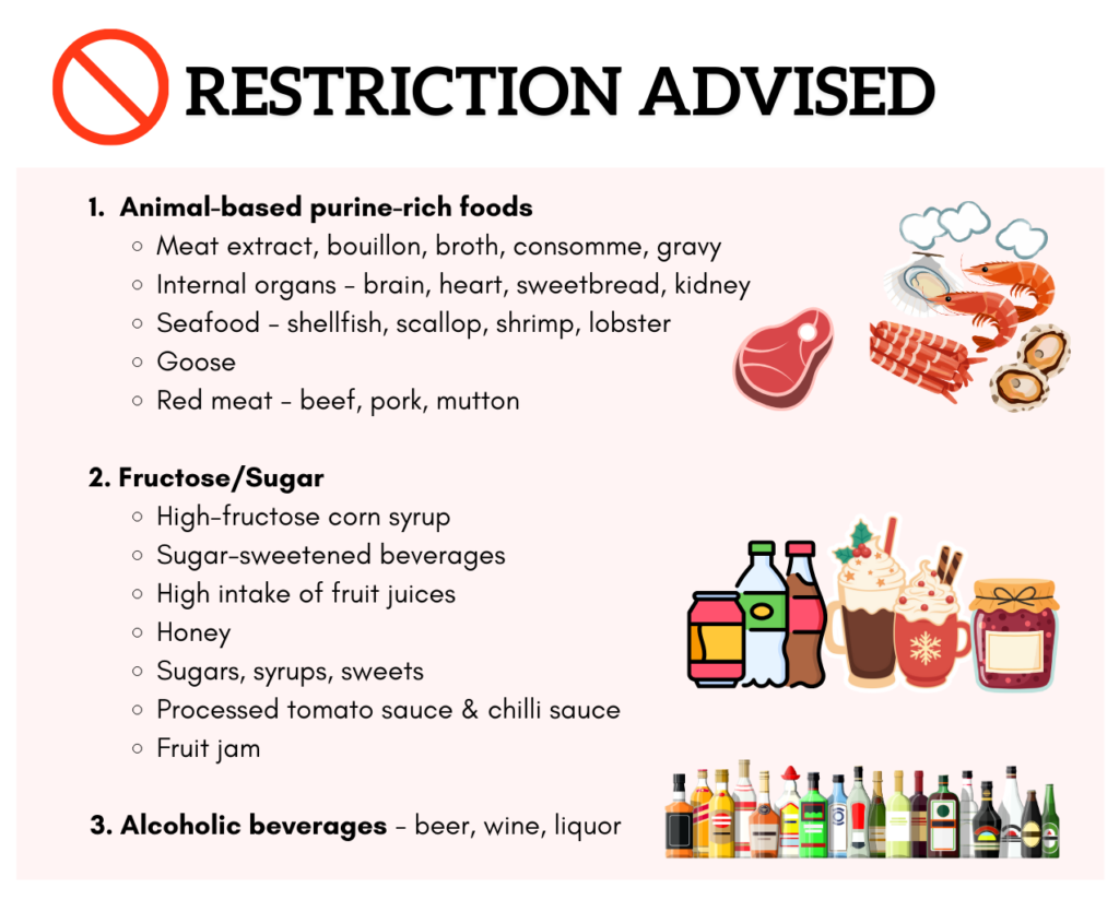– Discourages purine-rich red meat, fructose-rich foods, full-fat dairy products & saturated fat.