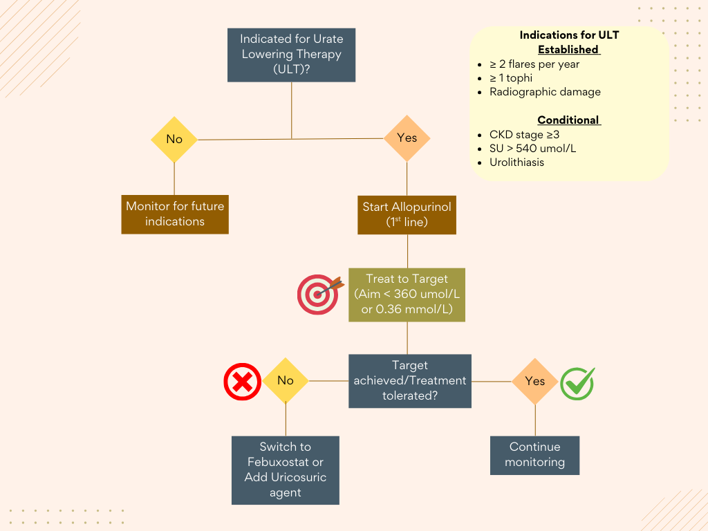 ULT: Allopurinol (1st line), Febuxostat (2nd line), Uricosuric agent (contraindicated)