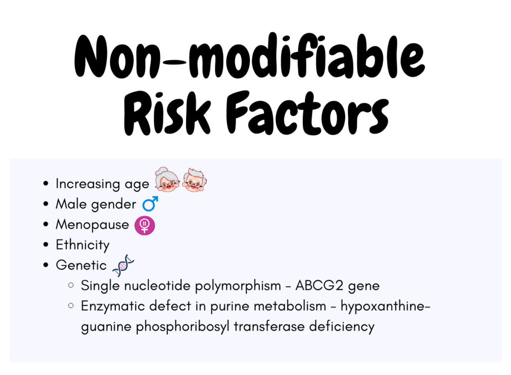 Extra-articular manifestation: Urolithiasis, Chronic nephropathy (Thus, don’t forget to assess also patient’s Renal Function)