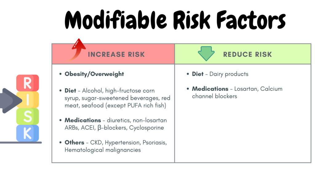 - Plant-based purine-rich foods are not associated with increased risk of gout.