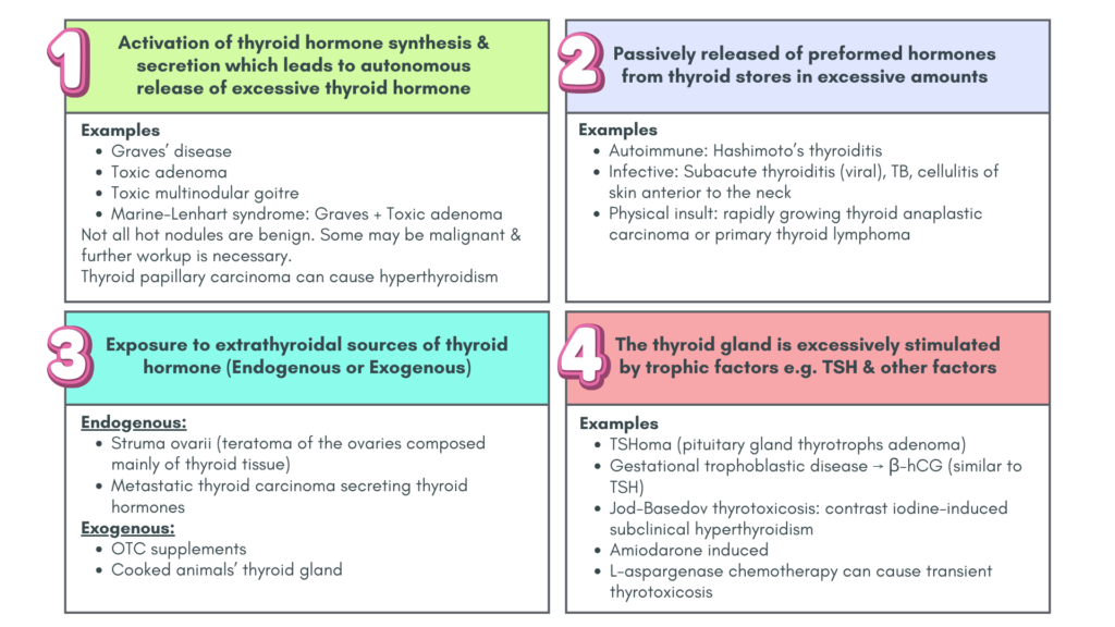 Due to inappropriately high thyroid hormone synthesis & secretion by the thyroid gland.