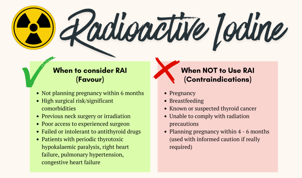 - Hyperthyroidism due to toxic multinodular goitre or toxic adenoma – for RAI/surgical intervention.