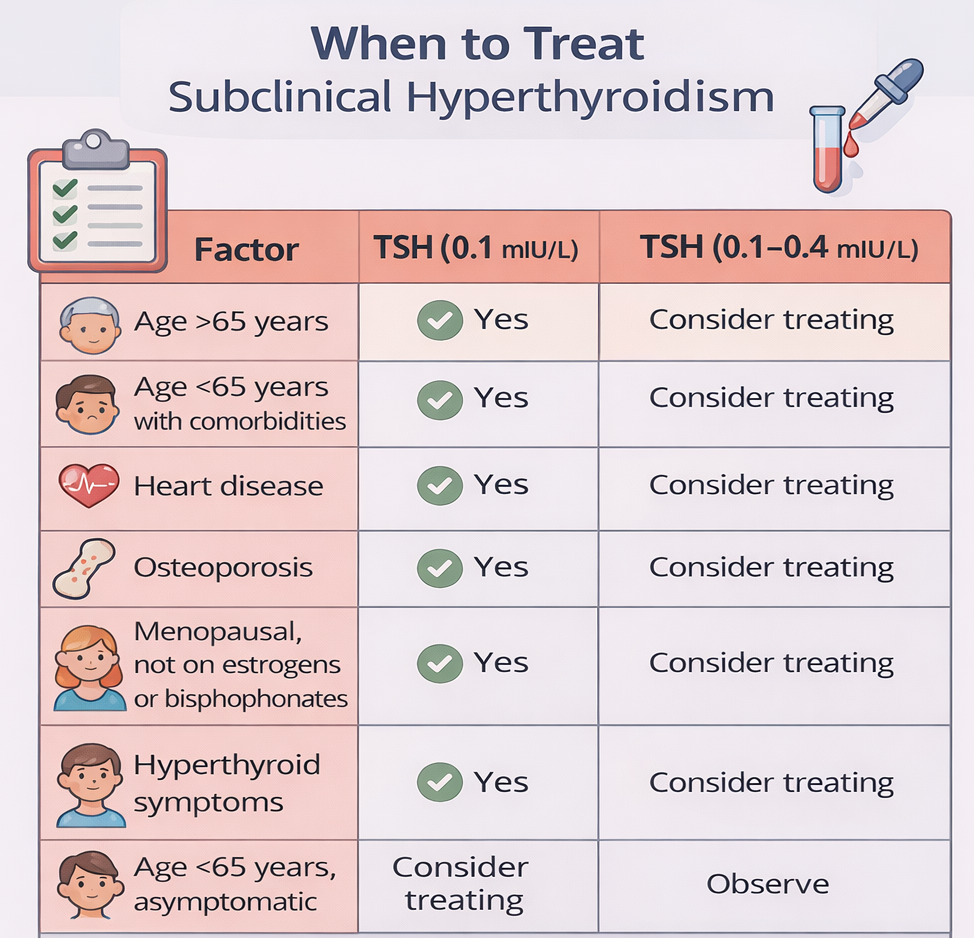 Current evidence suggest that subclinical hyperthyroidism is likely to cause AF, may probably increase the risk of mortality & fractures and possibly cause heart failure & cardiovascular events.