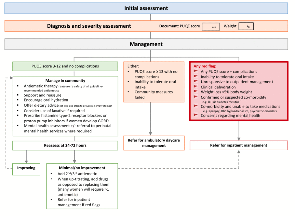 - Nelson-Piercy C, Dean C, Shehmar M, Gadsby R, O’Hara M, Hodson K, Nana M; Royal College of Obstetricians and Gynaecologists. The Management of Nausea and Vomiting in Pregnancy and Hyperemesis Gravidarum (Green-top Guideline No. 69). BJOG. 2024 Jun;131(7):e1-e30. doi: 10.1111/1471-0528.17739. Epub 2024 Feb 4. Erratum in: BJOG. 2025 Sep;132(10):1541. doi: 10.1111/1471-0528.18258. PMID: 38311315. From <https://pubmed.ncbi.nlm.nih.gov/38311315/>