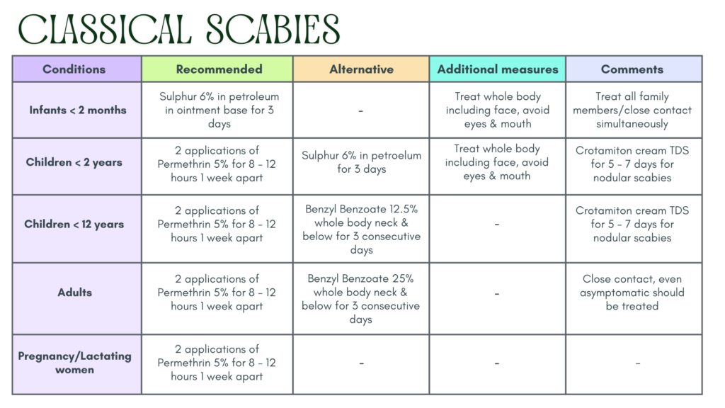 - For symptomatic contacts, two treatments are required (permethrin 5%)