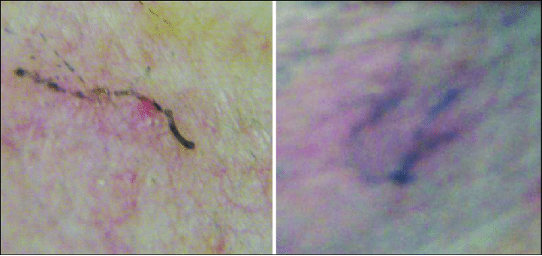 - The ink may be visualized tracking into the burrow (classical zigzag line) indicating the presence of burrow